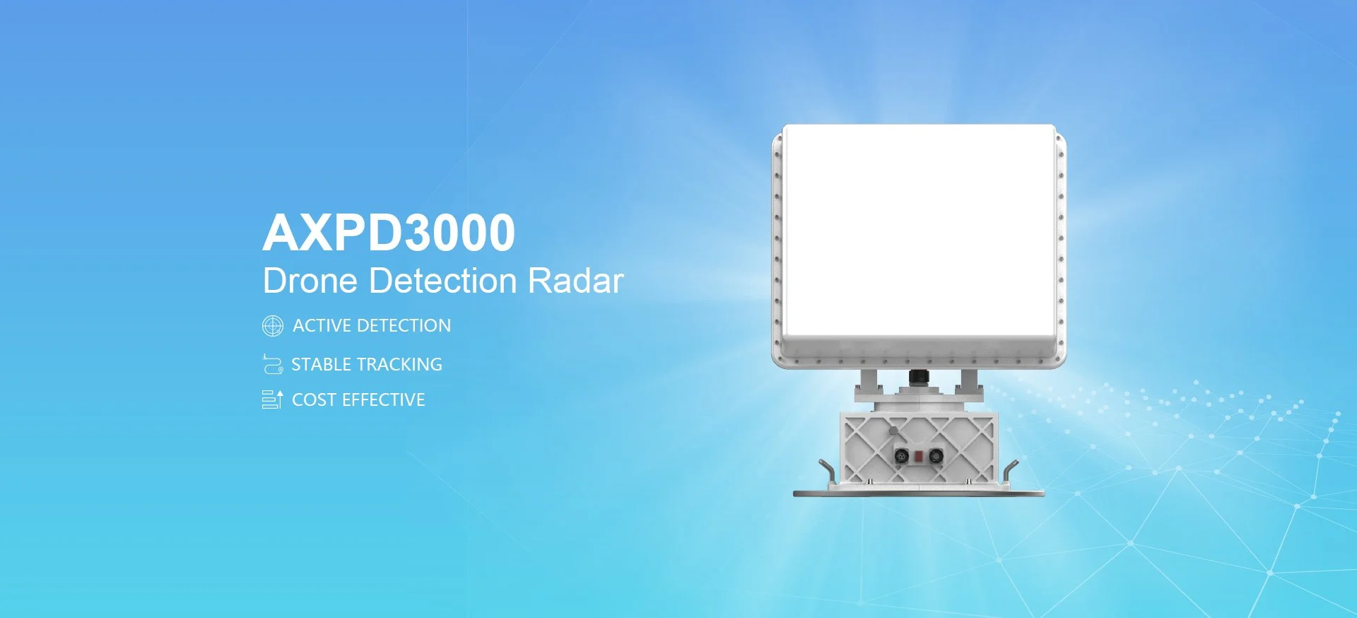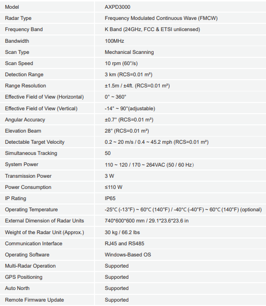 The AXPD3000 drone detection radar is a 3D radar, supporting 360° continuous detection of mini-UAVs up to 2 miles. It has the capability to identify up to 50 targets simultaneously with distance, azimuth, height, and speed data. It is perfect for anti-UAV application for correctional facilities, airports, critical infrastructure, oil refineries, government buildings and much more.