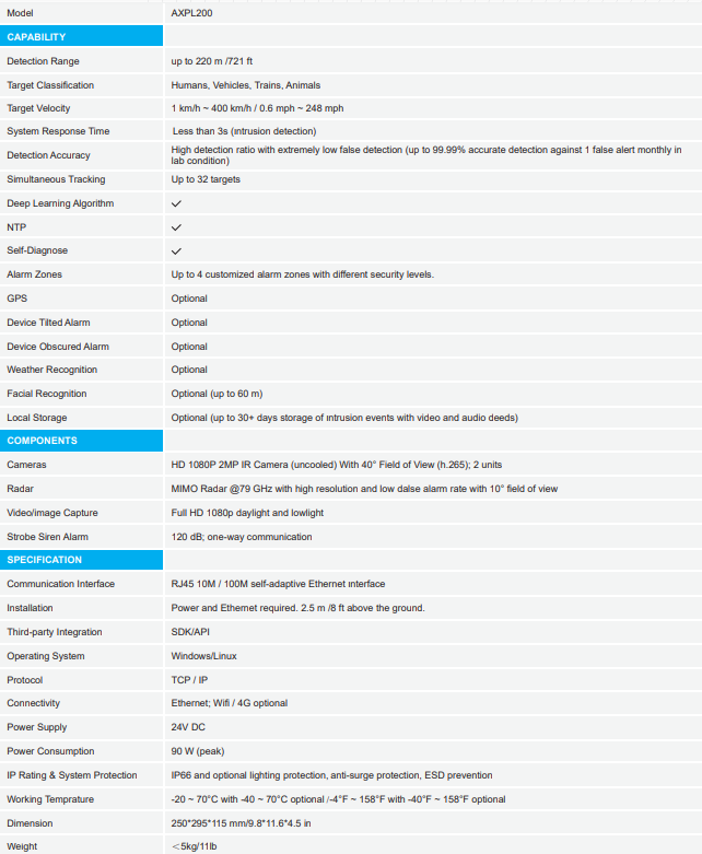 Built into the AXPL200 is a long range high definition radar and a AI video camera solution providing the user with a wealth of information. It is highly configurable and scalable system and is tailored to secure an entire site.